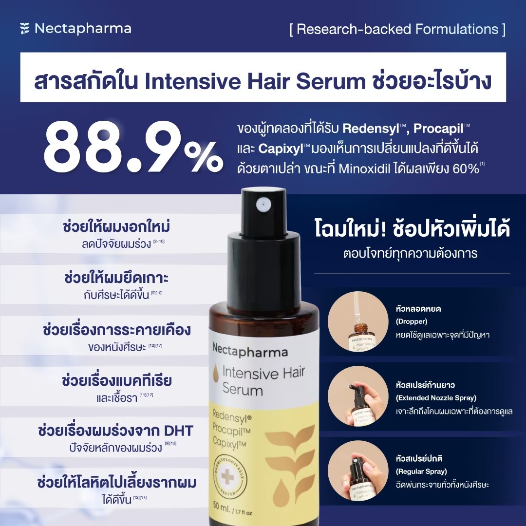 เซรั่มลดผมร่วง Nectapharma ไม่ได้ช่วยแค่ลดการหลุดร่วงของเส้นผม แต่ยังช่วยฟื้นฟูรากผมและหนังศีรษะ ทั้งการกระตุ้นการงอกใหม่และลดปัจจัยเสี่ยงจากผมร่วงหลากหลายสาเหตุ