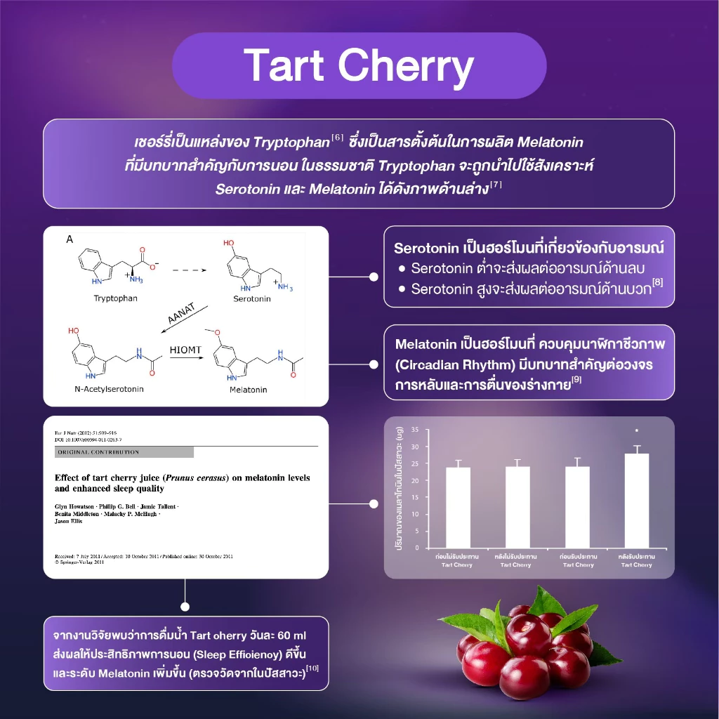 - การรับประทาน Tart Cherry ซึ่งเป็นแหล่งของ Tryptophan สารตั้งต้นในการสังเคราะห์ Melatonin ช่วยปรับสมดุลนาฬิกาชีวภาพ (Circadian Rhythm) และ Serotonin ซึ่งเป็นฮอร์โมนที่เกี่ยวข้องกับอารมณ์เชิงบวก[6]