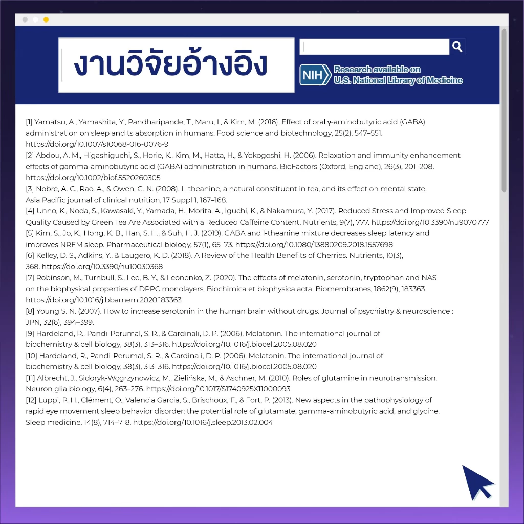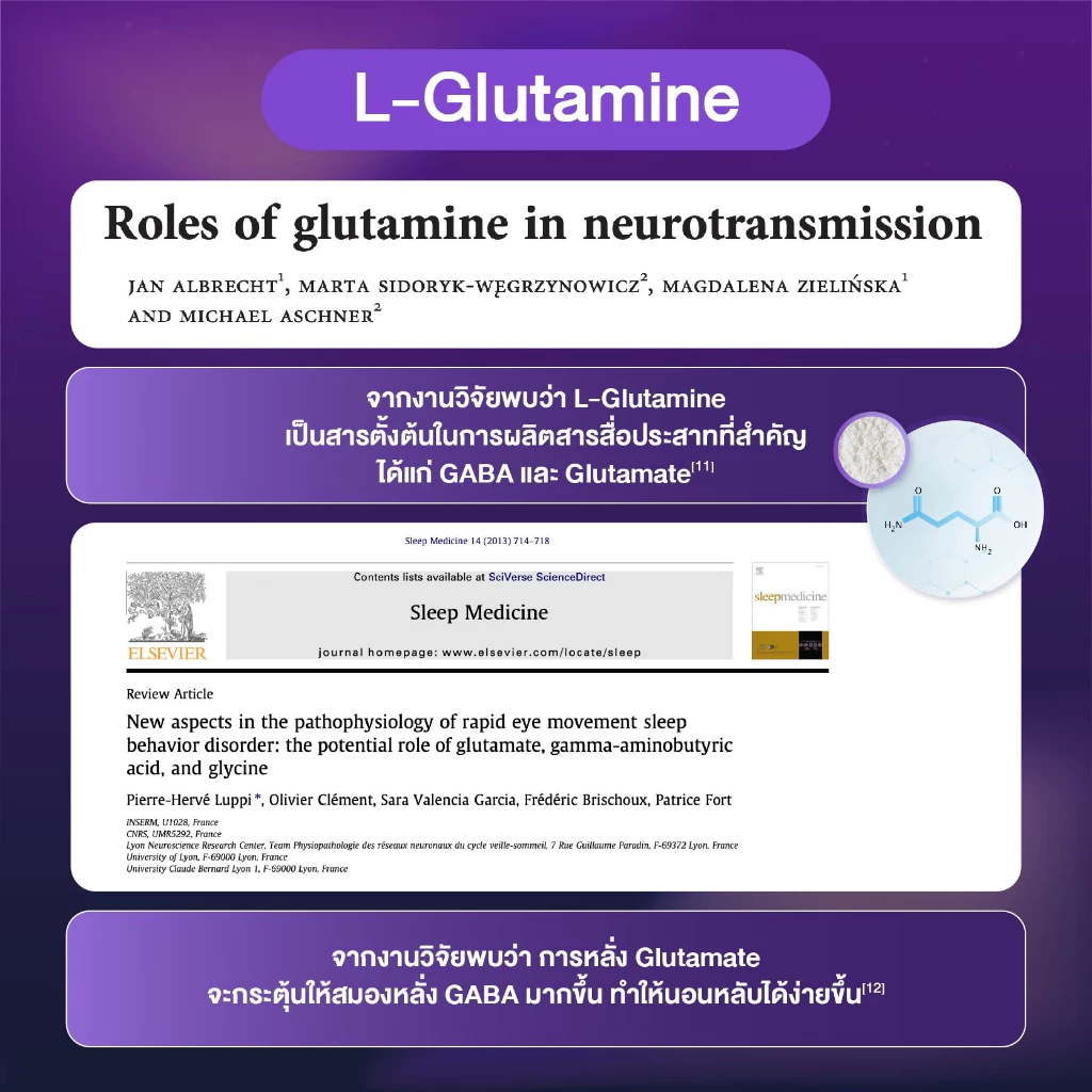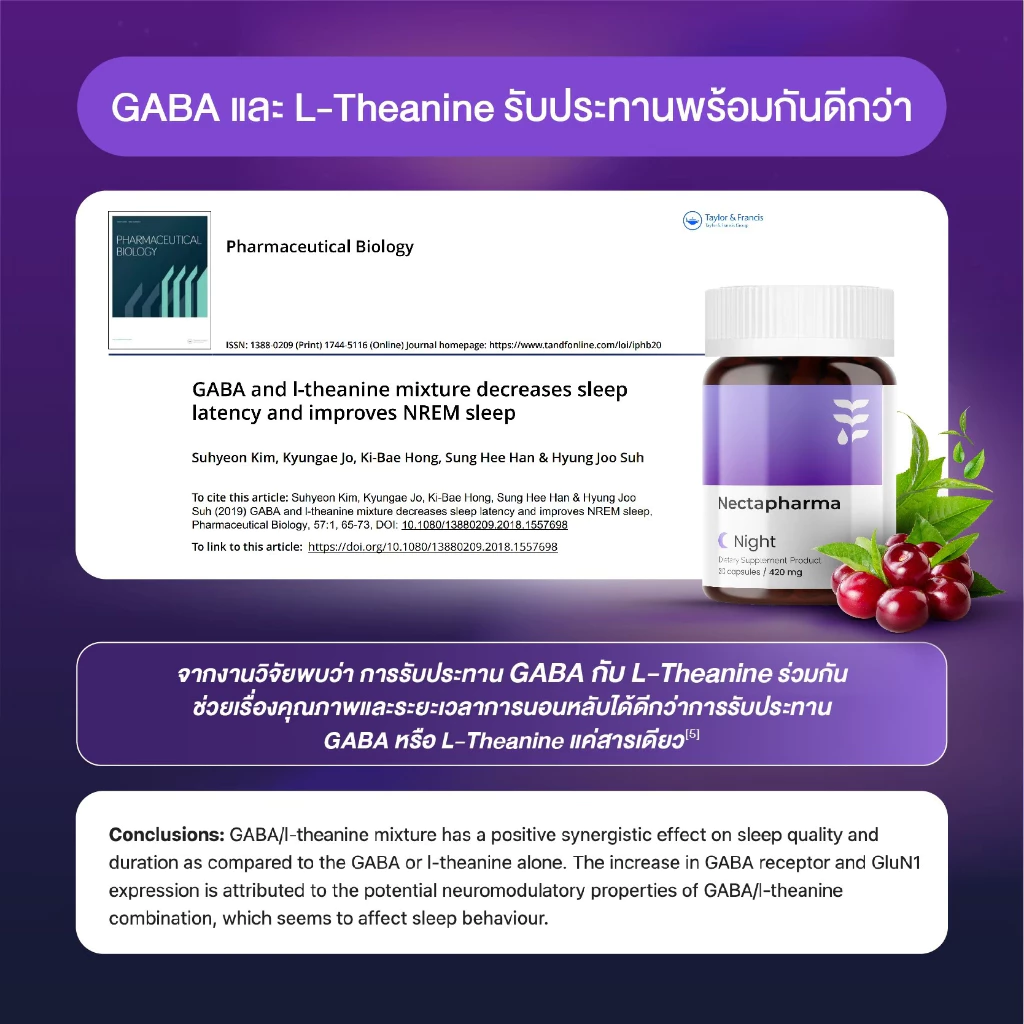 ช่วยเพิ่มทั้งคุณภาพและระยะเวลาการนอนหลับได้ดียิ่งกว่าการรับประทาน GABA หรือ L-Theanine เพียงตัวใดตัวหนึ่ง นับว่าเป็นวิตามินช่วยเรื่องการนอนหลับที่ถูกคิดค้นสูตรมาเพื่อให้ได้ประโยชน์สูงสุดจากการทำงานร่วมกันของสารสำคัญ[8]