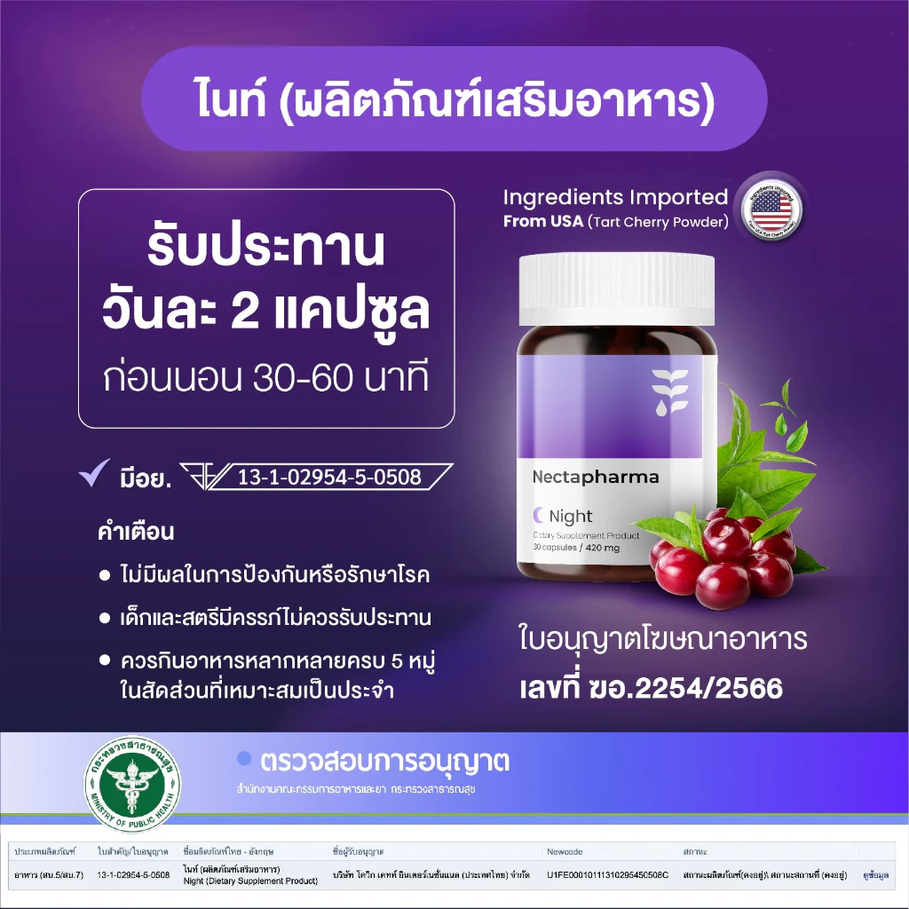 | Tart Cherry Powder (ผงเชอร์รี่ทาร์ต) | 140 mg |