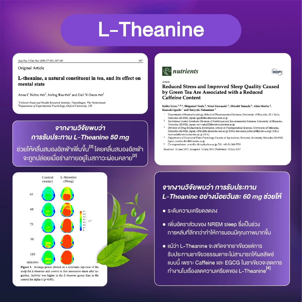 - การรับประทาน L-Theanine ช่วยลดความเครียด โดยวัดจากระดับคลื่นสมองอัลฟ่าที่เพิ่มขึ้น ซึ่งสะท้อนถึงภาวะสมองที่สงบและผ่อนคลาย[7]