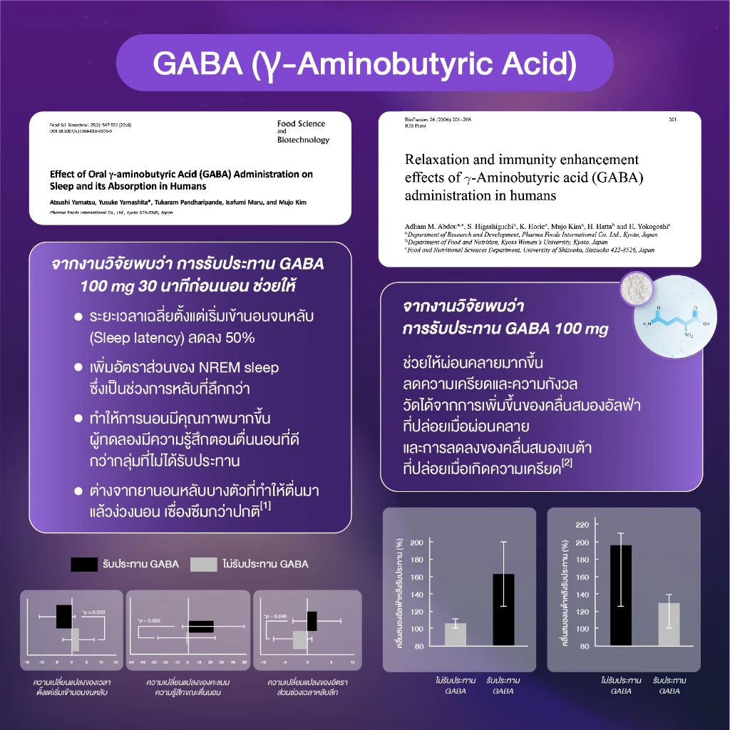 การรับประทาน GABA 100 mg/วัน ก่อนนอน 30 นาที ช่วยให้หลับได้เร็วขึ้น โดยพบว่าระยะเวลาเฉลี่ยตั้งแต่เริ่มเข้านอนจนหลับ (Sleep latency) ลดลงได้ถึง 50% อีกทั้งยังช่วยเพิ่มระยะเวลาการหลับลึก โดยประเมินจากการเพิ่มขึ้นของอัตราส่วน NREM sleep[1] นอกจากนี้ยังช่วยให้รู้สึกผ่อนคลายและลดความเครียด โดยวัดจากระดับคลื่นสมองที่เปลี่ยนแปลง ซึ่งสะท้อนถึงภาวะสมองที่สงบและผ่อนคลาย[2]