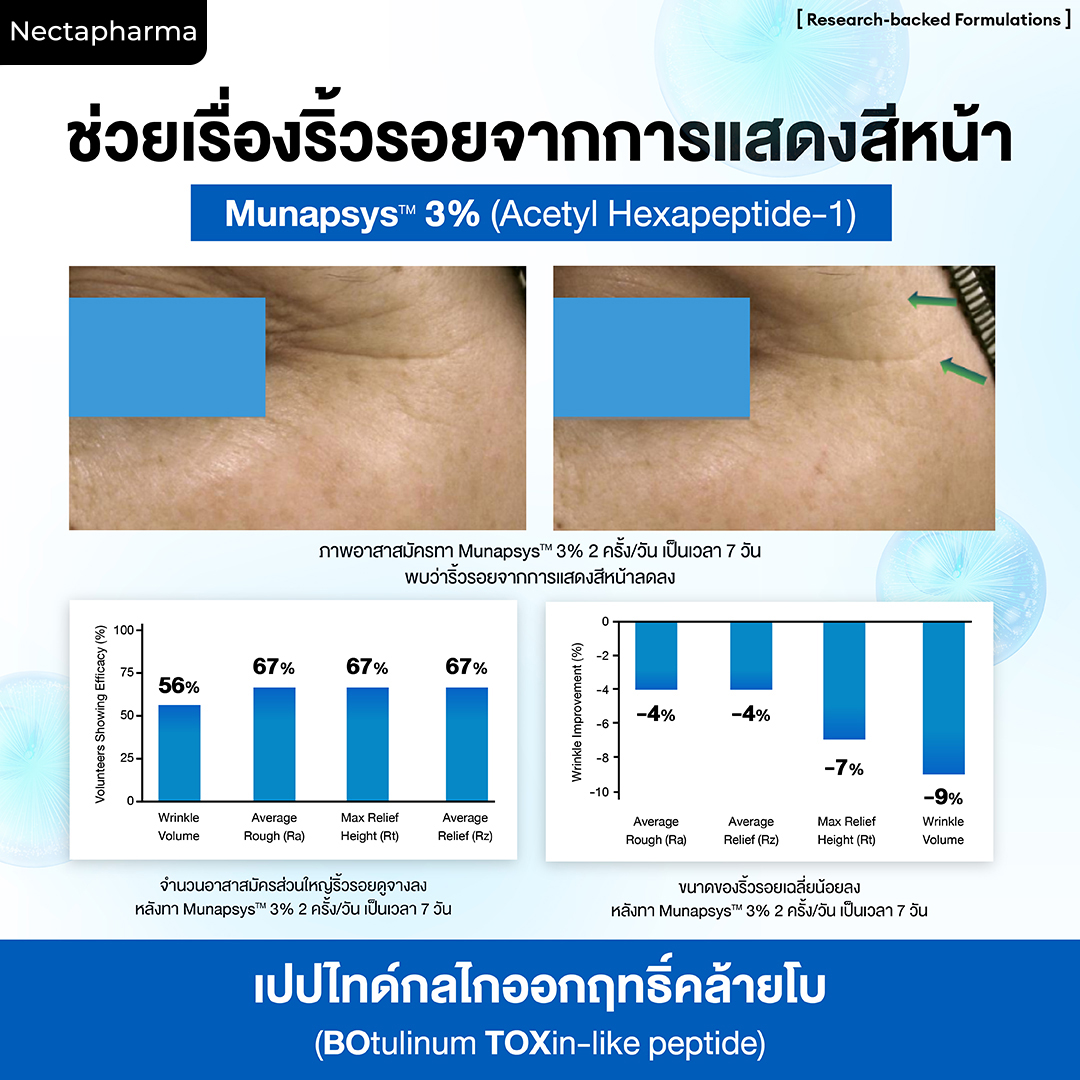 ด้วย Botox-like Peptide ที่มีกลไกการทำงานคล้ายโบท็อกซ์ เปรียบเสมือนโบท็อกซ์แบบทา ช่วยลดการทำงานของกล้ามเนื้อที่เป็นสาเหตุของริ้วรอย ให้ผิวเรียบเนียน