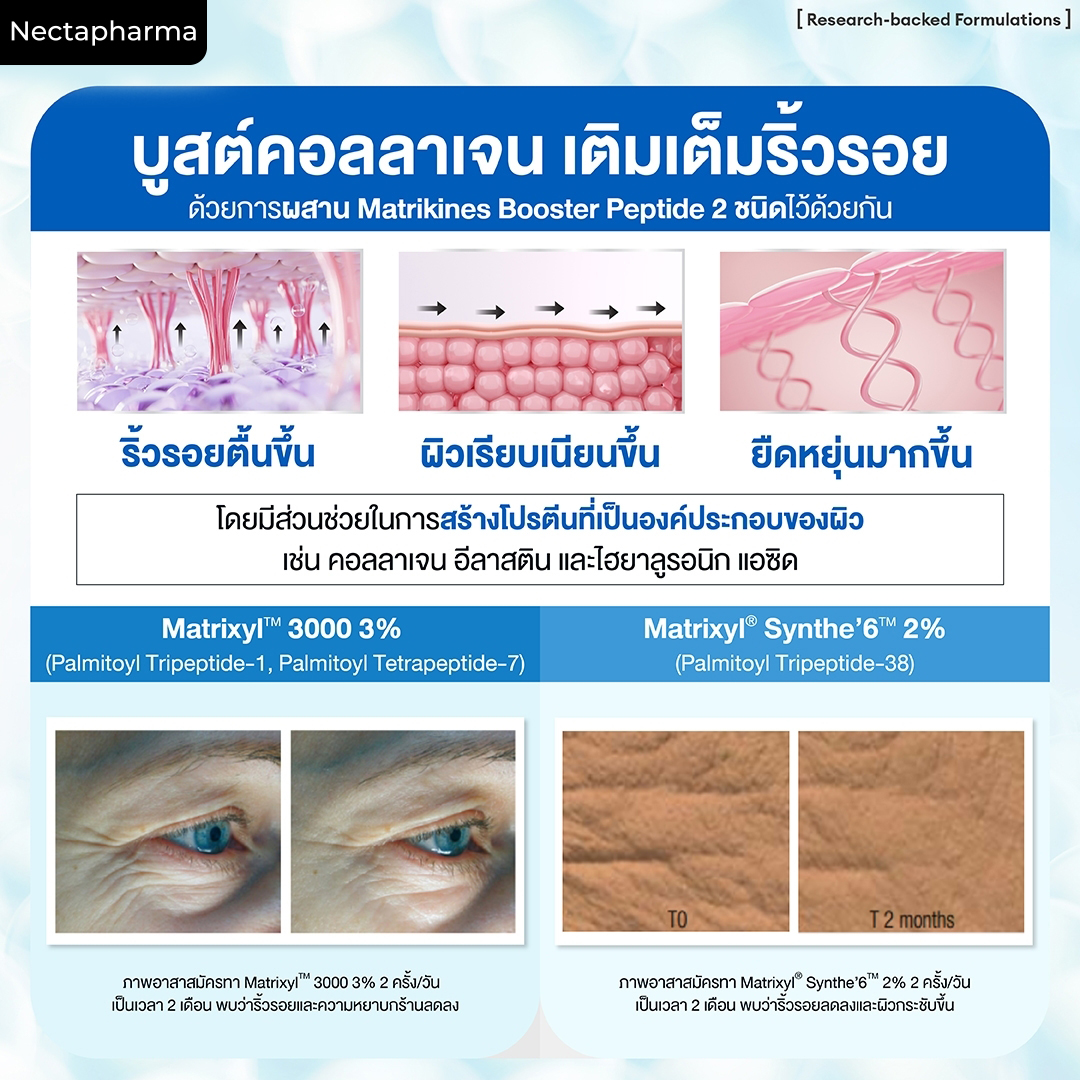 ด้วย Matrikine Booster Peptide ที่ช่วยบูสต์คอลลาเจนและอีลาสติน พร้อมเพิ่มความยืดหยุ่นให้ผิวดูเต่งตึงมีชีวิตชีวา เสริมการทำงานของเซรั่มลดริ้วรอยให้เห็นผลลัพธ์ชัดเจนยิ่งขึ้น