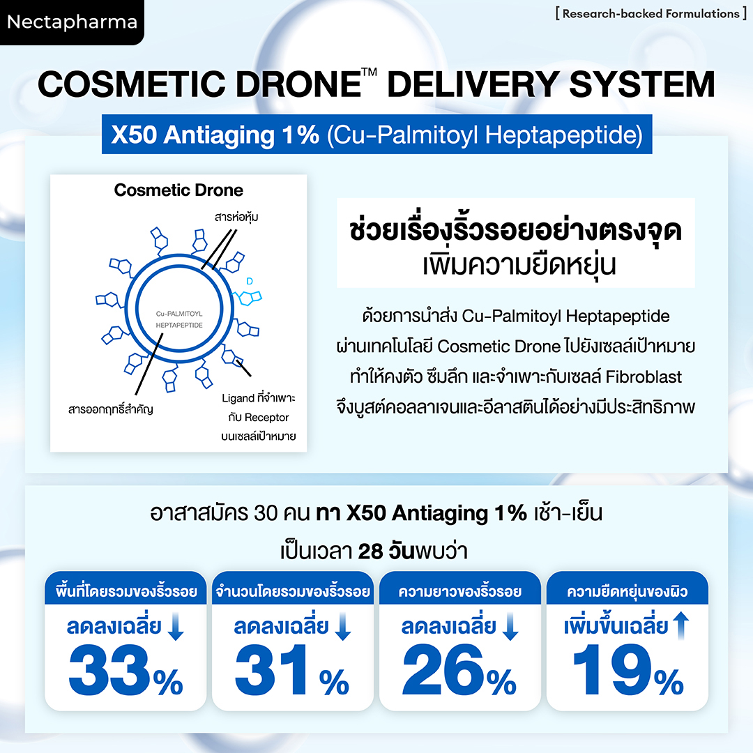 นำส่งเปปไทด์ด้วยเทคโนโลยี Cosmetic Drone™ Delivery System ให้ซึมลึกเข้าสู่ผิวอย่างตรงจุด ช่วยให้เปปไทด์เซรั่ม บูสต์คอลลาเจนและอีลาสตินได้เต็มประสิทธิภาพ[5]