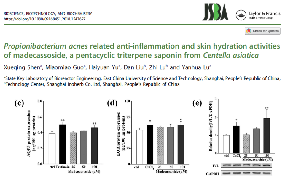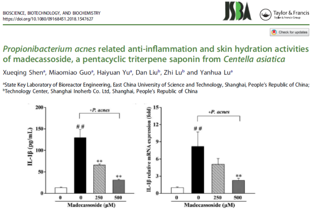 สารสกัดใบบัวบก (Centella Asiatica Extract, Cica) โดยเฉพาะ Madecassoside มีคุณสมบัติช่วยลดการอักเสบของผิวและช่วยปลอบประโลมผิวได้อย่างมีประสิทธิภาพ จากงานวิจัยพบว่าสามารถยับยั้งการหลั่ง IL-1β ซึ่งเป็นสารก่อการอักเสบที่เกิดขึ้นจากเชื้อสิว Cutibacterium Acnes (C. Acnes) ส่งผลให้การอักเสบและรอยแดงลดลง พร้อมเสริมเกราะป้องกันผิวให้แข็งแรง เหมาะสำหรับผู้มีผิวแพ้ง่าย ผิวอักเสบ หรือผิวที่มีแนวโน้มเป็นสิว ที่ต้องการการดูแลอย่างอ่อนโยนและปลอดภัย [3]