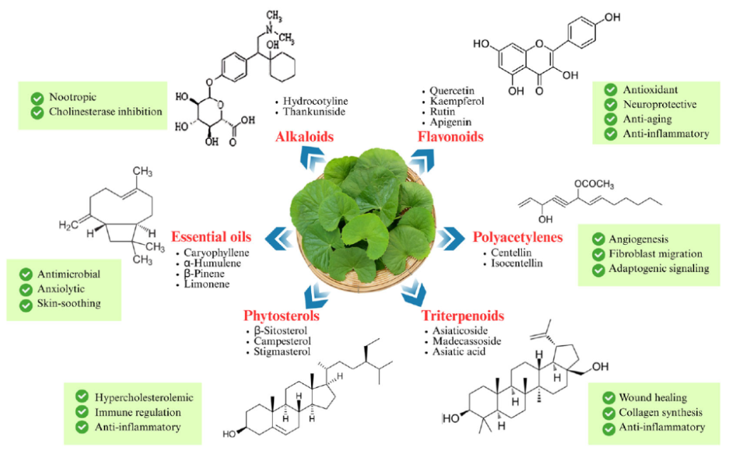 Gotu Kola ไม่ได้เป็นเพียงสมุนไพรที่ใช้ในตำรับยาโบราณเท่านั้น แต่ยังเป็นพืชที่ได้รับการศึกษาทางวิทยาศาสตร์อย่างกว้างขวาง โดยเฉพาะในด้าน การลดการอักเสบ, การฟื้นฟูเนื้อเยื่อ, และ การต้านอนุมูลอิสระ ทำให้ Gotu Kola Extract กลายเป็นส่วนผสมสำคัญในผลิตภัณฑ์เสริมอาหารที่ให้ผลลัพธ์จากภายในสู่ภายนอก[1]