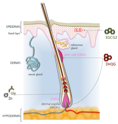 - กระตุ้นการงอกของเส้นผม โดยกระตุ้น Wnt/β-catenin pathway ซึ่งเป็นตัวควบคุมหลักของการงอกของเส้นผม ช่วยให้เซลล์ต้นกำเนิดในรากผมแบ่งตัวได้ดีขึ้น