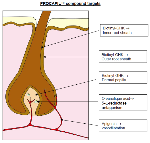 นอกจากนี้ การศึกษาระดับยีน (DNA array study) ยังพบว่า Procapil™ ช่วยเพิ่มการแสดงออกของยีนที่เกี่ยวข้องกับการสร้างพลังงานในเซลล์ การแบ่งตัวของเซลล์ และการต้านอนุมูลอิสระซึ่งช่วยปกป้องรากผมจากความเสื่อมและการอักเสบ[1]