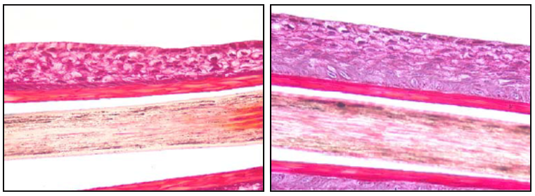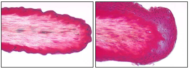 รากผมและปลอกหุ้มรากผมแข็งแรงขึ้น มีการจัดเรียงของโปรตีน Collagen IV และ Laminin 5 ที่สมบูรณ์ขึ้น ซึ่งบ่งบอกถึงรากผมที่ยึดเกาะแน่นและแข็งแรงกว่าเดิม[1]