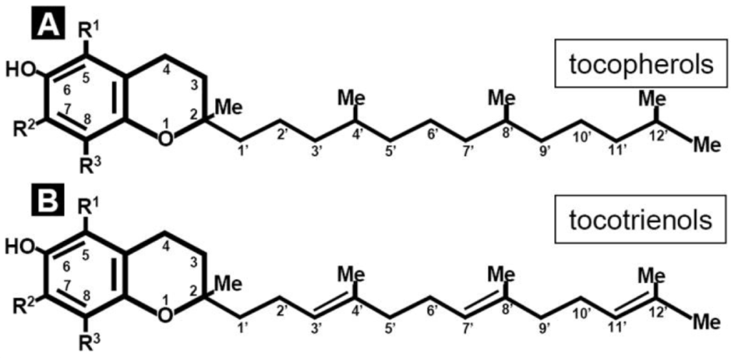 วิตามินอีมีอยู่ 2 กลุ่มหลัก คือ Tocotrienol (โทโคไตรอีนอล) และ Tocopherol (โทโคฟีรอล) ซึ่งทั้งสองกลุ่มมีโครงสร้างทางเคมีที่คล้ายคลึงกัน ต่างกันเพียงโครงสร้างของหางโมเลกุล ความแตกต่างเล็ก ๆ นี้ส่งผลให้ Tocotrienol และ Tocopherol เป็นวิตามินอีมีคุณสมบัติที่แตกต่างกัน โดย Tocotrienol ที่มีโครงสร้างของหางไม่อิ่มตัว จะสามารถในการซึมเข้าสู่เนื้อเยื่อและเยื่อหุ้มเซลล์ได้ดีกว่า Tocopherol ทีมี่โครงสร้างของหางที่อิ่มตัว ทำให้ Tocotrienol มีฤทธิ์ทางชีวภาพที่หลากหลายและมีประสิทธิภาพมากกว่า[1], [2]