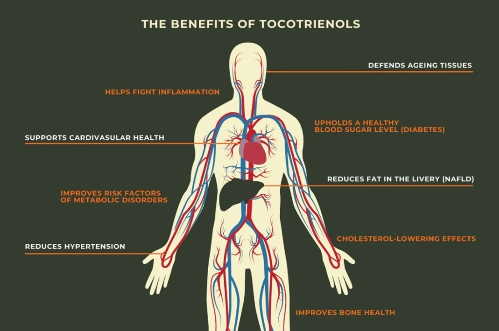 การรับประทาน Tocotrienol ส่งผลดีต่อส่วนต่าง ๆ ของร่างกายอย่างครอบคลุม ทั้งระบบหัวใจและหลอดเลือด ระบบประสาทและสมอง และระบบภูมิคุ้มกัน