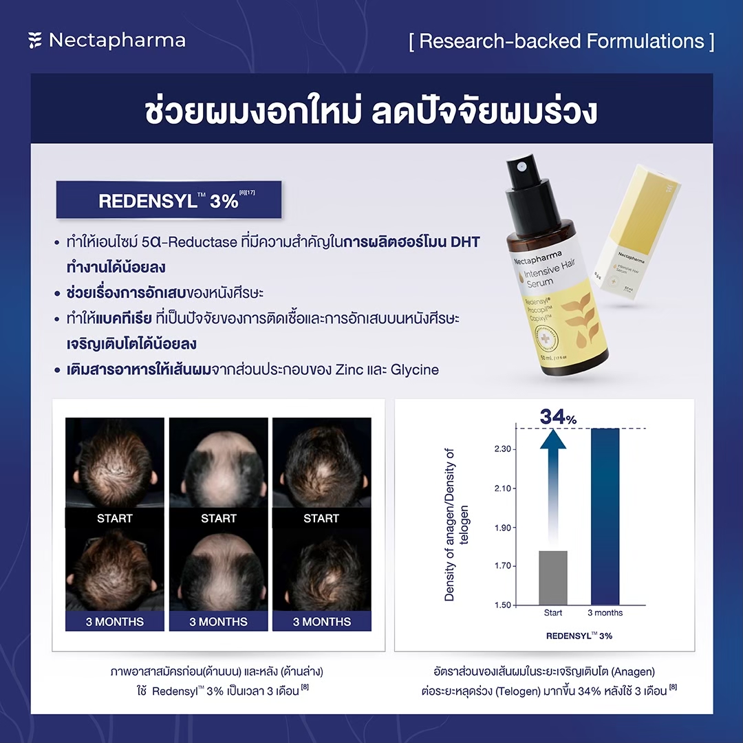 เซรั่มลดผมร่วง Nectapharma ไม่ได้ช่วยแค่ลดการหลุดร่วงของเส้นผม แต่ยังช่วยฟื้นฟูรากผมและหนังศีรษะ ทั้งการกระตุ้นการงอกใหม่และลดปัจจัยเสี่ยงจากผมร่วงหลากหลายสาเหตุ